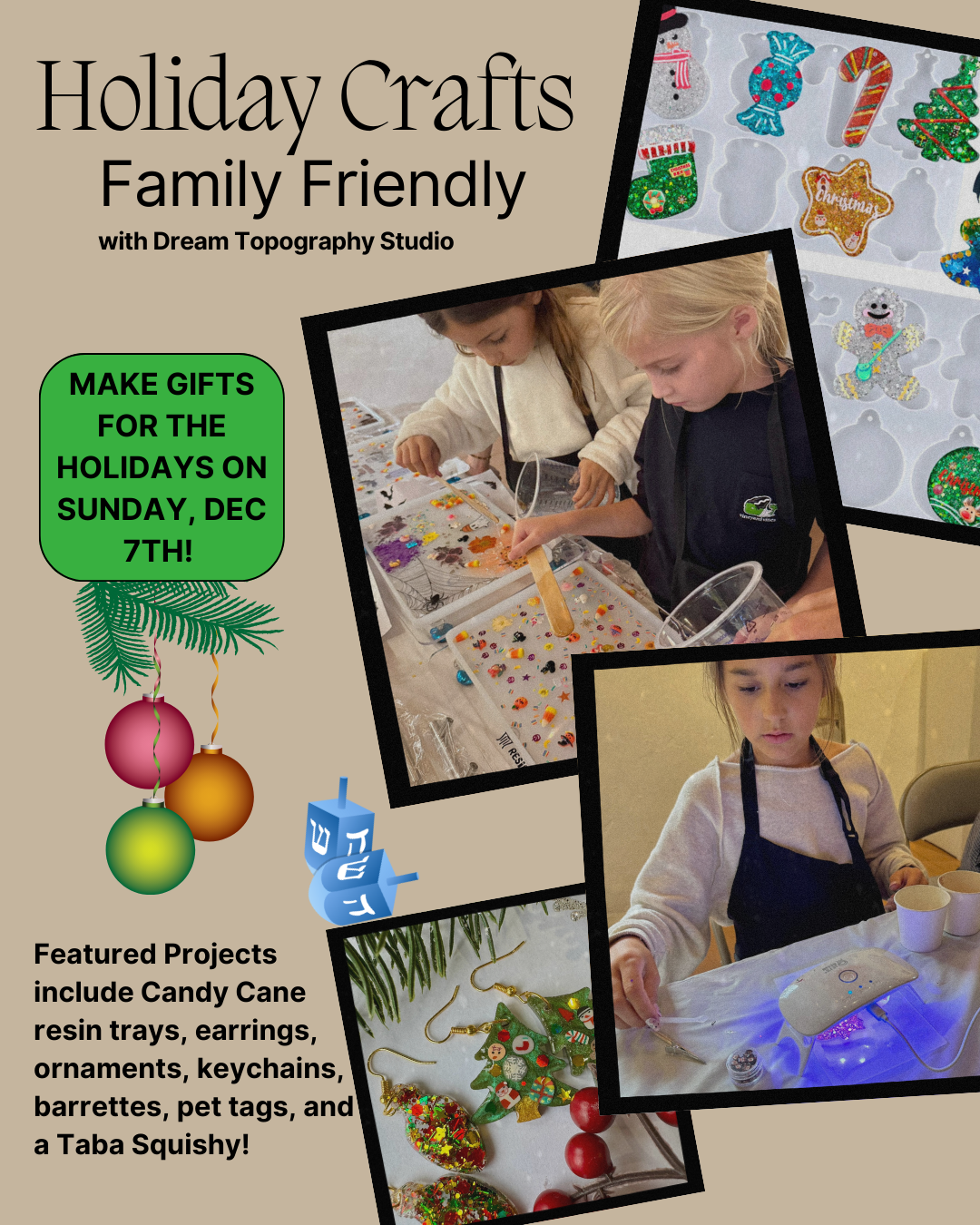 Celebrate the Holiday season creating fun crafts and homemade gifts using UV resin! We will also be creating a large candy cane resin tray. Smaller crafts will include ornaments, pendant necklaces, keychains, post earrings, barrettes, and even a Taba Squishy! All art supplies and smocks are provided.